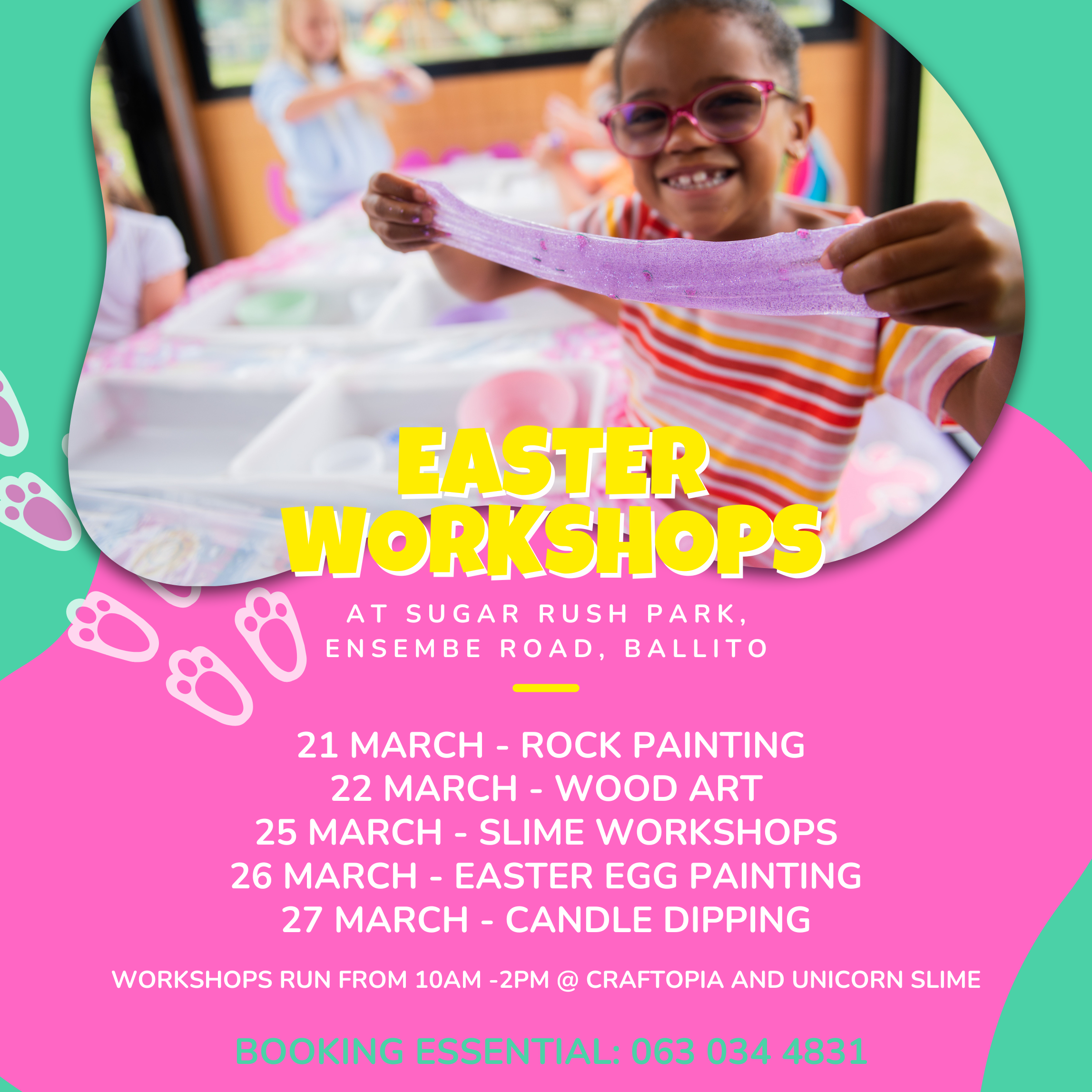 Sugar Rush21 March - Rock Painting 22 March - Wood Art 25 March - Slime Workshops 26 March - Easter Egg Painting 27 March - Candle Dipping Workshops Run From 10AM - 2PM @ Craftopia and Unicorn Slime Booking Essential : 063 034 4831